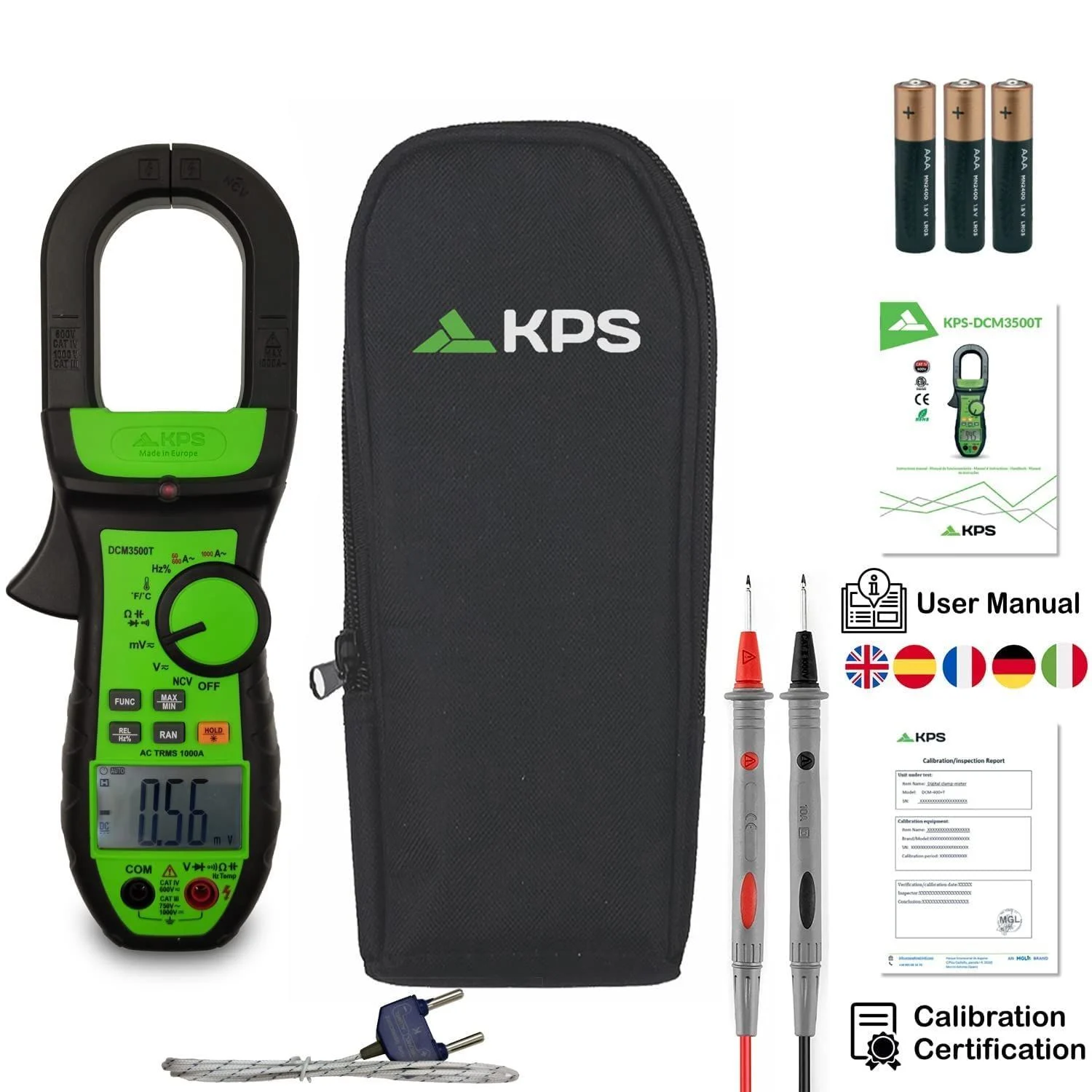 | Aksesuarlar | Test kabloları, kullanım kılavuzu, kalibrasyon sertifikası, K Tipi Sıcaklık probu, piller ve çanta |